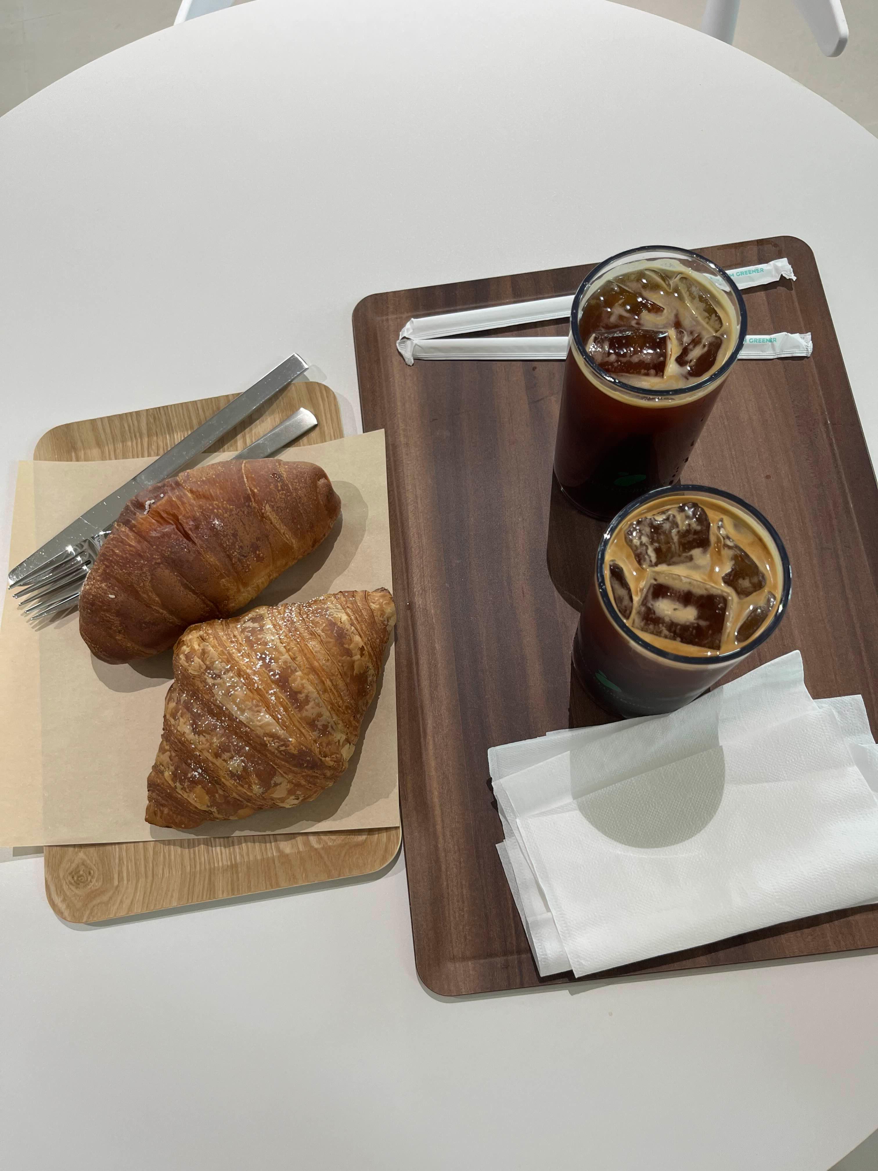 커피와 소금빵, 크루아상을 주문해 먹었는데 커피는 맛있었고 소금빵은 질기고 기름져서 제 취향은 아니었어요.